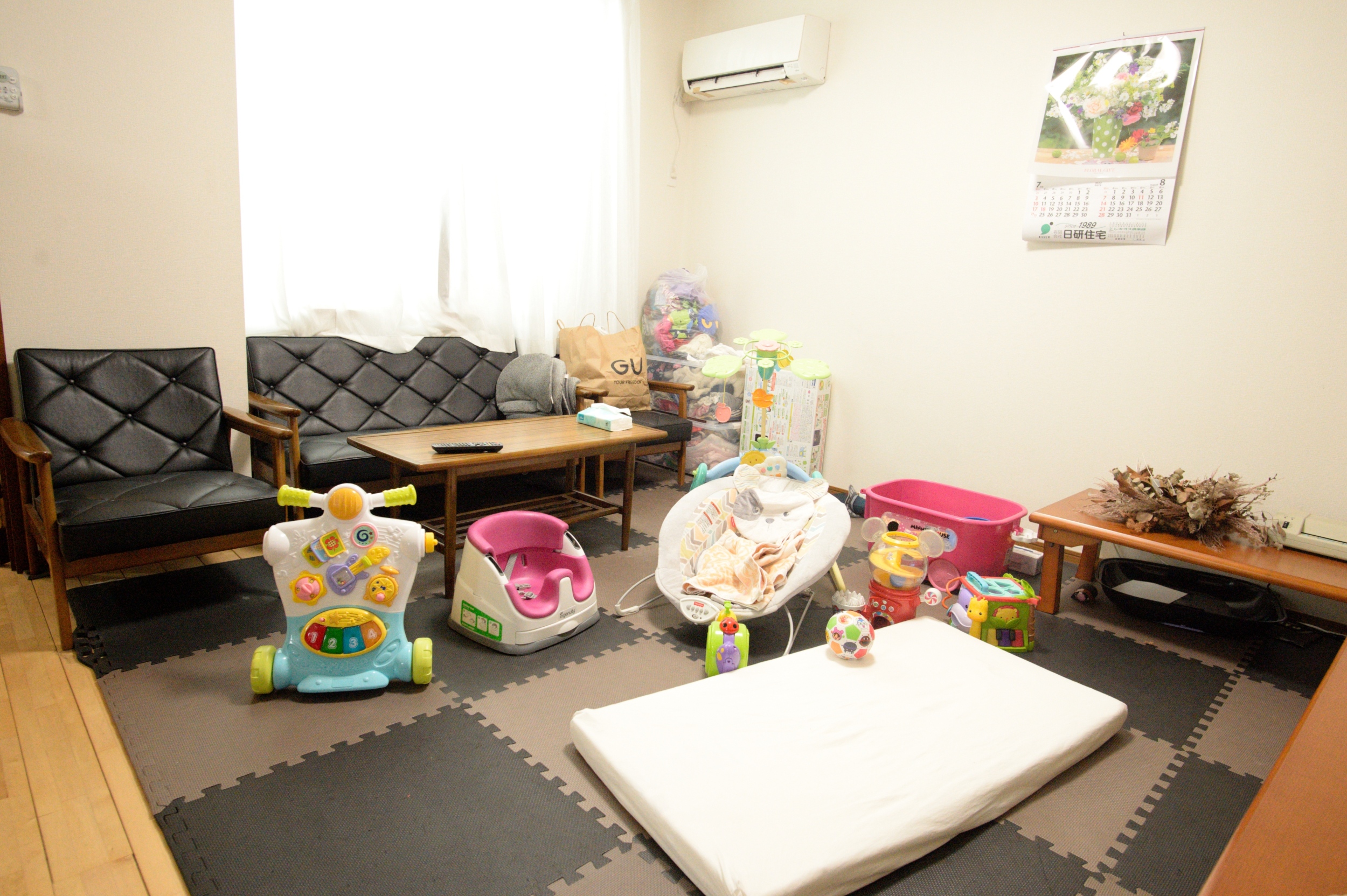ジョイントマットを敷いているスペースでオムツの交換や、ミルクのお湯なども準備していますのでご安心下さい。 飽きない様にお気に入りグッズをお持ち頂く事をオススメします。